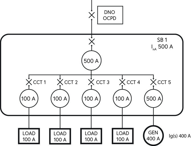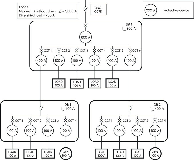 Figure 1 shows an example where the total connected load is 1,000 A (10 x 100 A) and the total diversified load is 750 A. The design does not meet the requirements of Regulation 551.7.2 of BS 7671:2018+A2:2022+A3:2024 because the rated current of the upstream OCPD for SB 1 is 800 A and the total rated output of the generating sets connected to SB 1 is 200 A, giving a total of 1,000 A. This exceeds the rated current of the assembly of 800 A as shown in Equation 1 below: